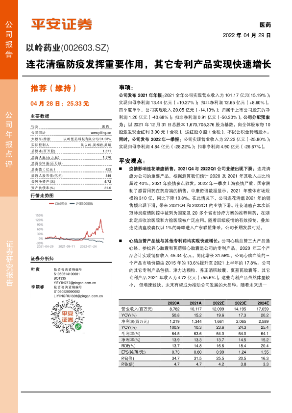 本报告分析了以岭药业2021年年报和2022年一季报,指出疫情对连花清瘟销售产生负面影响,导致公司业绩出现波动。同时,心脑血管产品线和其他专利药的快速增长为公司提供了新的增长动力。尽管下调了盈利预测,但维持“推荐”评级,并提示了行业政策、药品降价和原材料价格波动等风险。