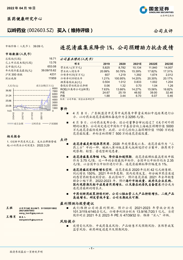 本报告分析了以岭药业在连花清瘟集采降价1%的背景下,通过捐赠助力抗击疫情的事件。报告指出,连花清瘟作为新冠推荐用药,集采降价幅度温和,且未来在海外市场、政府采购和居民自备需求等多重因素驱动下,仍有持续增长空间。此外,中药创新药政策利好以及公司心脑血管产品和研发管线的良好发展态势,都为以岭药业的长期成长提供了支撑。因此,报告维持对以岭药业的“买入”评级,并提示了相关风险。