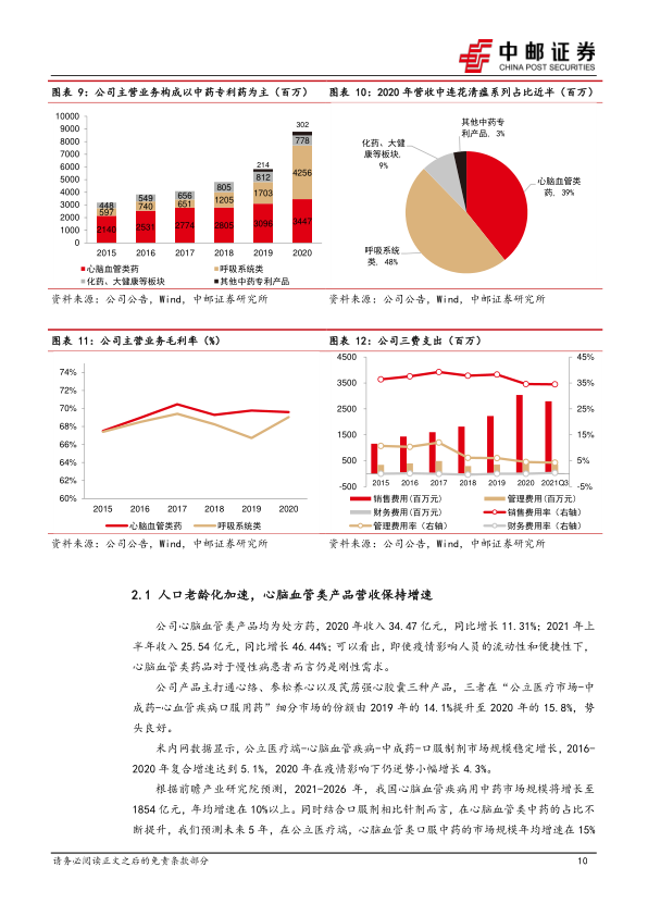 (1) 人口老龄化不断加深,心脑血管类中成药需求水涨船高。 公司以通心络、参松养心以及芪苈强心胶囊为主要产品, 2020 年实现收入 34.47 亿元,同比增长 11.31%; 2021 年上半年收入 25.54 亿元,同比增长 46.44%,市占率进一步提升。