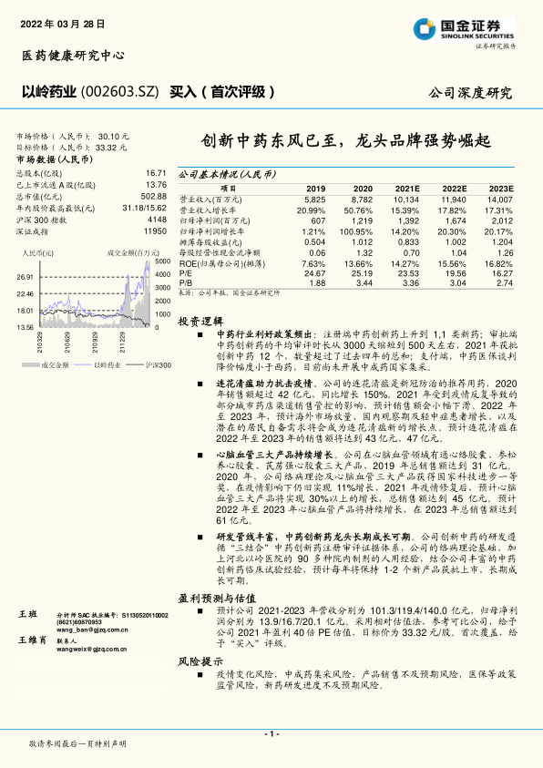 采用市盈率法对公司进行估值,参考可比公司(新天药业、健民集团、同仁堂、天士力、片仔癀),给予公司2021年盈利40倍PE估值,目标价为33.32元/股。首次覆盖,给予“买入”评级。
