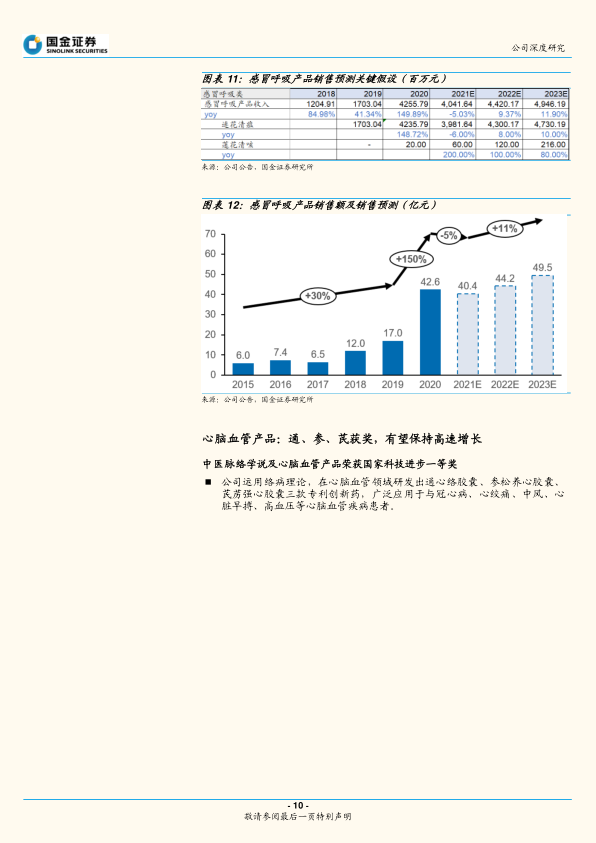 心脑血管三大产品持续增长。 公司在心脑血管领域有通心络胶囊、参松养心胶囊、芪苈强心胶囊三大产品, 2019 年总销售额达到 31 亿元。2020 年,公司络病理论及心脑血管三大产品获得国家科技进步一等奖,在疫情影响下仍旧实现 11%增长, 2021 年疫情修复后, 预计心脑血管三大产品将实现 30%以上的增长, 总销售额达到 45 亿元。预计2022 年至 2023 年心脑血管产品将持续增长, 在 2023 年总销售额达到61 亿元。