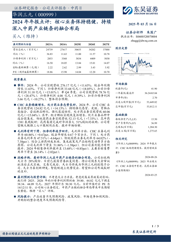 华润三九2024年业绩表现稳健,核心业务持续增长,盈利能力有所提升。公司通过战略并购,积极布局中药产业链,有望实现中长期增长。虽然面临集采等政策影响,但公司整体发展态势良好,维持“买入”评级。投资者需关注产品放量、政策、市场竞争以及并购整合等风险。