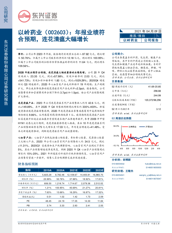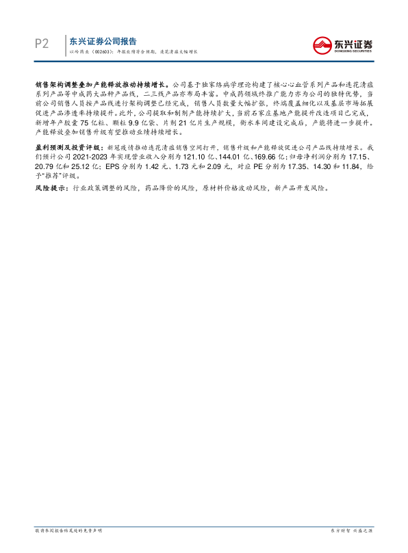 盈利预测及投资评级: 新冠疫情推动连花清瘟销售空间打开,销售升级和产能释放促进公司产品线持续增长。 我们预计公司 2021-2023 年实现营业收入分别为 121.10 亿、 144.01 亿、 169.66 亿;归母净利润分别为 17.15、20.79 亿和 25.12 亿; EPS 分别为 1.42 元、 1.73 元和 2.09 元,对应 PE 分别为 17.35、 14.30 和 11.84,给予“推荐”评级。