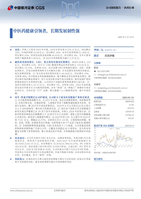 事件:华润三九发布2024年年报,2024年营业收入276.17亿元,同比增长12%;归母净利润33.68亿元,同比增长18%;扣非归母净利润31.18亿元,同比增长15%。经营活动现金流净额44.02亿元,同比增长5%。全年计提各项资产减值准备3.08亿元,对2024年利润影响为减少2.57亿元。