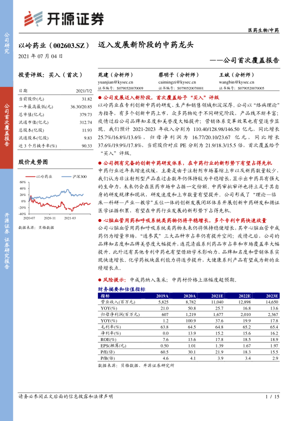 以岭药业作为国内专利创新中药龙头企业,凭借深厚的研发积淀、疫情后品牌知名度的显著提升以及营销体系的逐步变革,已迈入新的发展阶段。报告首次覆盖即给予“买入”评级,预计公司在2021-2023年将实现收入和归母净利润的持续稳健增长,当前估值处于历史低位,具备投资安全边际。