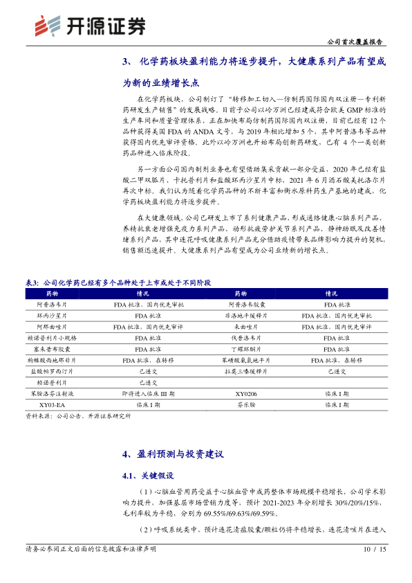 公司心脑血管用药和呼吸系统类药物未来仍将保持稳健增长,其中心脑血管中成药仍为增量市场,“通参芪”三大品种市占率仍有提升空间; 疫情之后,公司的品牌知名度和品牌美誉度大幅提升, 连花清瘟系列药品市占率和市场覆盖率大幅提升。此外还有其他专利中药也有望借助学术影响力、品牌知名度和营销体系实现快速增长。 化学药板块盈利能力将逐步提升,大健康系列产品有望成为新的业绩增长点。