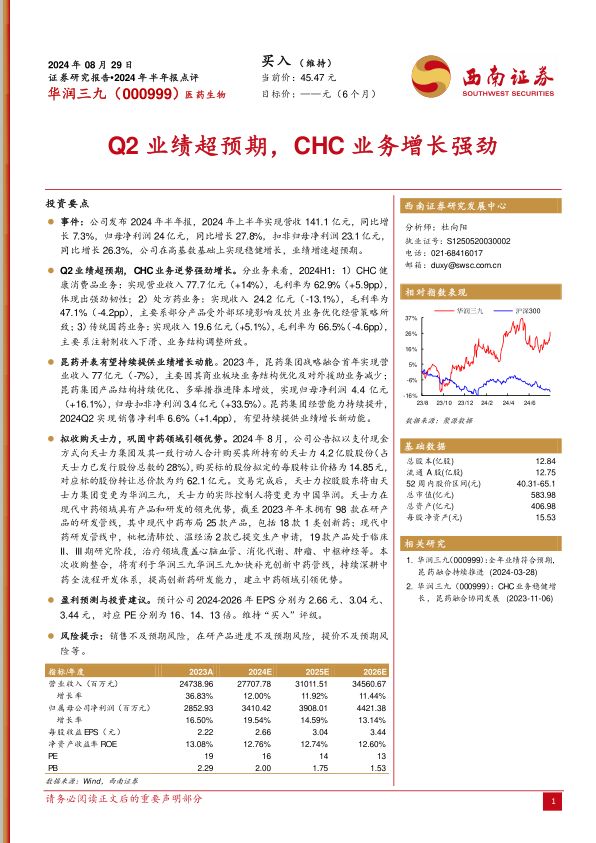 根据分析师预测,华润三九的盈利能力将持续增强。预计公司2024年至2026年的每股收益(EPS)分别为2.66元、3.04元和3.44元。对应的市盈率(PE)分别为16倍、14倍和13倍,显示出估值吸引力。基于此,分析师维持对华润三九的“买入”评级。