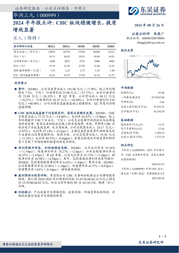 华润三九 2024 年半年报显示,公司在 CHC 业务的稳健增长和提质增效的推动下,盈利能力显著提升。尽管处方药板块受到外部环境影响,但国药业务仍保持增长。分析师上调了盈利预测,维持“买入”评级,但同时也提示了相关风险。