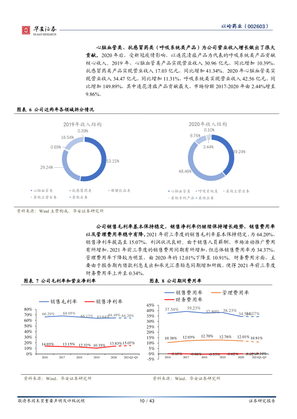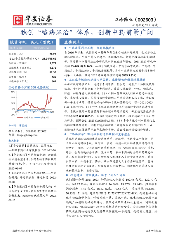 我们预计公司 2021-2023 年营业收入分别为 102.45 亿元, 122.70 亿元, 147.17 亿元,分别同比增长 16.66%、 19.77%、 19.94%,归母净利润分别为 13.42 亿元、 16.12 亿元、 19.53 亿元,同比增长 10.12%、20.13%、 21.16%,对应的 PE 为 32.73X/27.25X/22.49X, 我们看好公司现有心脑血管中药、呼吸系统中药、其他中药、化生药物及健康产业领域产品借助良好的品牌力、临床疗效所带来的放量能力。同时也看好公司以“络病证治”理论体系打造的科研壁垒。公司后续中药创新药及化生药物的逐步兑现将带来估值进一步提高。我们首次覆盖,给予公司“买入”的评级。