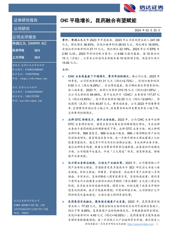 华润三九2023年业绩表现亮眼,CHC业务平稳增长,品牌OTC和处方药业务均有亮点。昆药集团的有效融合为公司发展注入新动力。