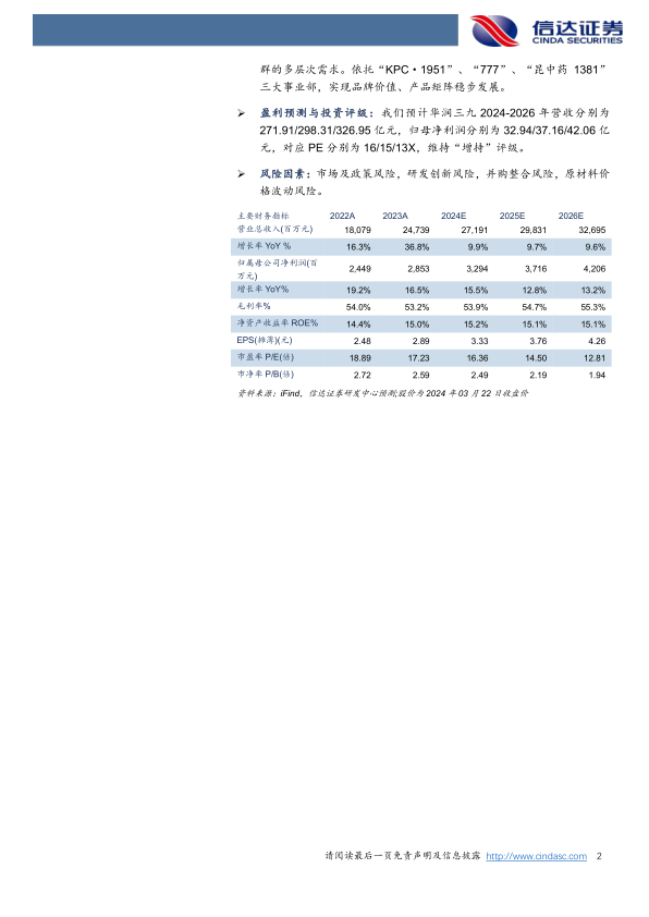 我们预计华润三九 2024-2026 年营收分别为 271.91/298.31/326.95亿元,归母净利润分别为32.94/37.16/42.06亿元,对应PE分别为16/15/13X,维持“增持”评级。