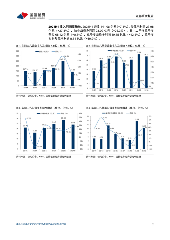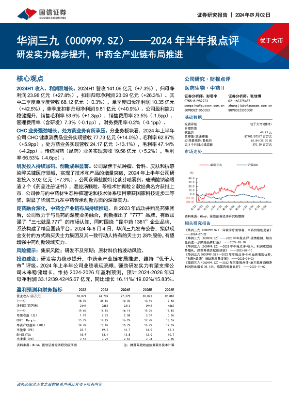 华润三九2024年上半年业绩表现亮眼,营收和利润实现双增长,盈利能力稳健提升。CHC业务强劲增长,处方药业务承压,传统国药业务稳步发展。公司持续加大研发投入,创新成果显著,中药全产业链布局持续推进。维持对公司2024-2026年盈利预测不变,维持“优于大市”评级。