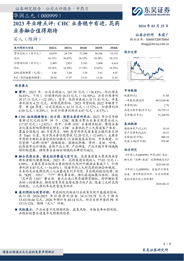 本报告的核心观点是:华润三九的 CHC(健康消费品)业务保持稳健增长,同时昆药集团的业务融合为公司带来了新的增长点。通过对华润三九 2023 年业绩的分析,报告指出公司在品牌 OTC 业务和康慢业务方面表现良好,而处方药业务受到政策影响有所承压。