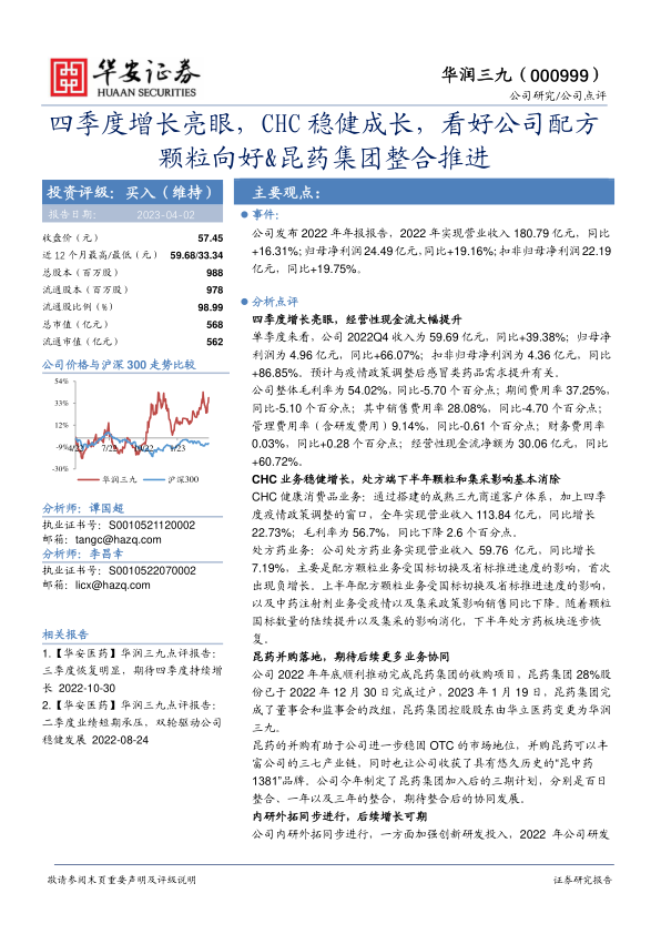 华润三九2022年业绩表现良好,四季度增长尤为亮眼。CHC业务保持稳健增长,处方药业务逐步恢复。公司成功并购昆药集团,并积极进行内研外拓,为未来增长奠定基础。维持“买入”评级,但需关注整合风险、新品推广风险以及疫情影响。