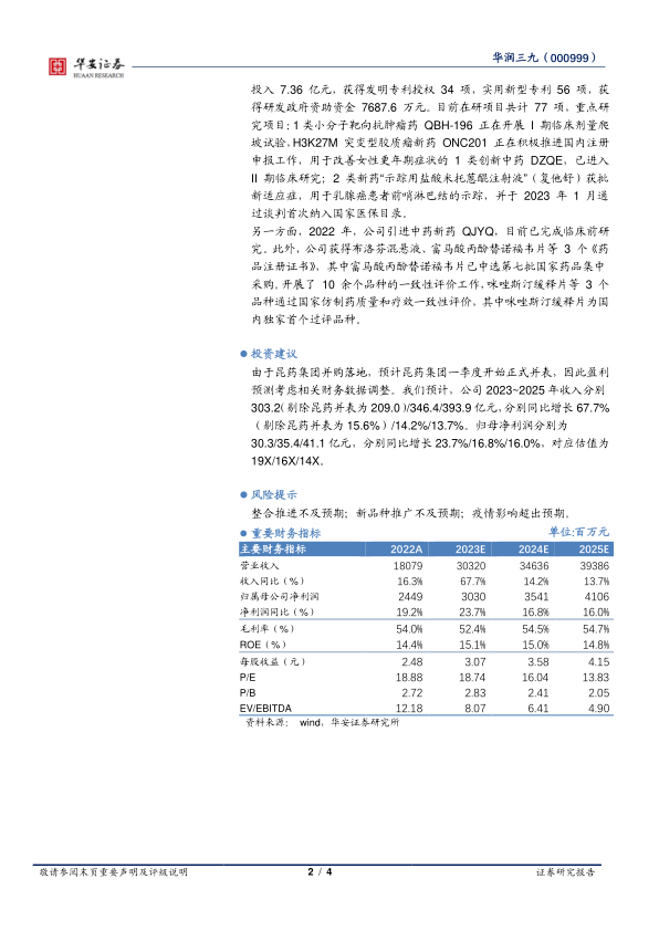 由于昆药集团并购落地,预计昆药集团一季度开始正式并表,因此盈利预测考虑相关财务数据调整。我们预计,公司2023~2025年收入分别303.2(剔除昆药并表为209.0)/346.4/393.9亿元,分别同比增长67.7%(剔除昆药并表为15.6%)/14.2%/13.7%。归母净利润分别为30.3/35.4/41.1亿元,分别同比增长23.7%/16.8%/16.0%,对应估值为19X/16X/14X。