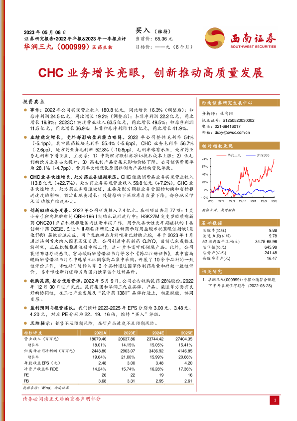 本报告对华润三九2022年年报和2023年一季报进行了深入分析,公司CHC业务增长亮眼,创新驱动业务发展,收购昆药整合优质资源,未来发展潜力巨大。虽然短期内处方药业务承压,但长期来看,随着创新药物的不断推出和市场拓展,公司业绩有望持续增长。维持“买入”评级,但需关注销售不及预期和在研产品进度不及预期的风险。