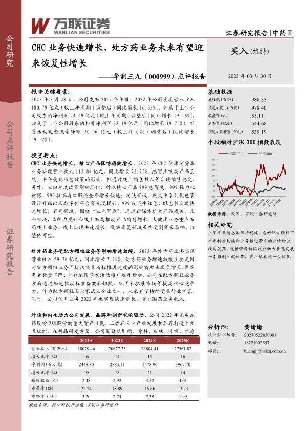 华润三九在2022年展现了强劲的业绩增长势头,营业收入和净利润均实现双位数增长。其中,CHC健康消费品业务是核心增长引擎,通过产品创新和数字化营销策略,有效巩固了市场地位。尽管处方药业务受政策影响增速放缓,但公司积极应对,尤其在中药配方颗粒领域具备先发优势,未来有望实现恢复性增长。通过收购昆药股份,公司进一步强化了产业协同和品牌影响力,并持续通过内生研发创新提升核心竞争力。尽管毛利率受处方药业务拖累,但公司通过优化销售费用,有效提升了净利润率。综合来看,华润三九作为OTC龙头企业,品牌优势显著,渠道网络不断扩张,未来增长潜力可期,维持“买入”评级。