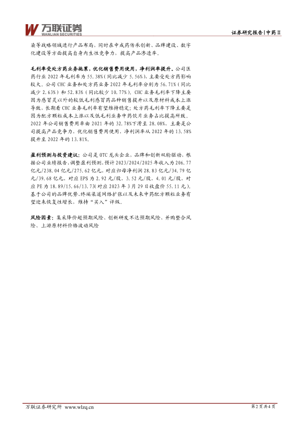 盈利预测与投资建议:公司是OTC龙头企业,品牌和创新双轮驱动,根据公司业绩报告,调整盈利预测,预计2023/2024/2025年收入为206.77亿元/238.04亿元/275.62亿元,对应归母净利润28.83亿元/34.79亿元/39.68亿元,对应EPS为2.92元/股,3.52元/股,4.01元/股,对应PE为18.89/15.66/13.73(对应2023年3月29日收盘价55.11元)。基于公司的品牌优势、终端渠道网络扩张以及未来中药配方颗粒业务有望迎来恢复性增长,维持“买入”评级。