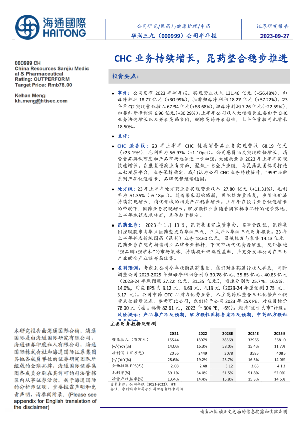 华润三九2023年上半年业绩表现亮眼,CHC业务持续增长,昆药集团并表带来新的增长动力。公司凭借其在中药OTC领域的品牌优势和对三七产业链的整合,未来发展潜力巨大。维持“优于大市”评级,但需关注产品推广、配方颗粒国标备案以及集采政策等风险因素。