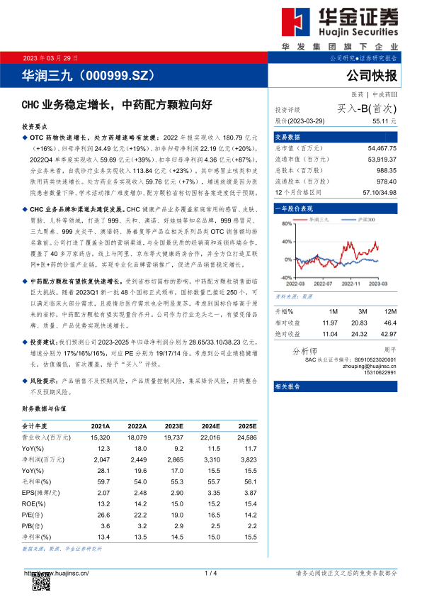 本报告对华润三九的业务发展和财务状况进行了全面分析,认为公司在 CHC 业务和中药配方颗粒业务方面具有显著优势,并给出了盈利预测和投资评级。