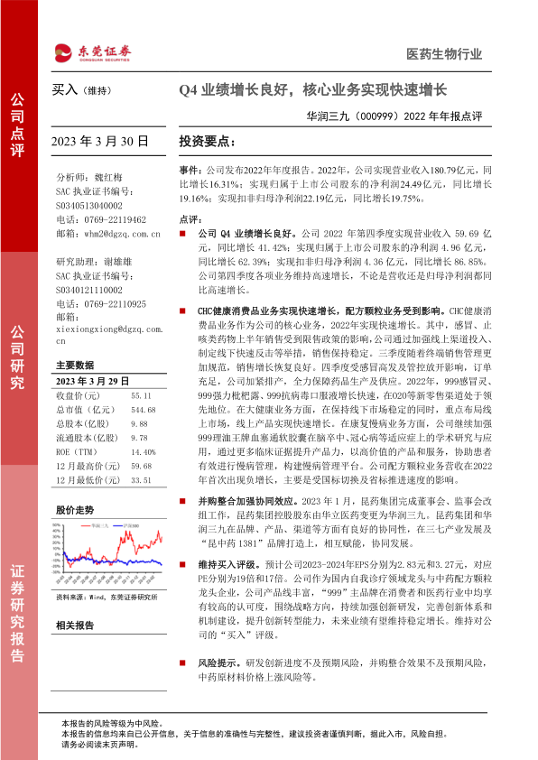 华润三九2022年业绩表现强劲,尤其四季度增长显著。CHC健康消费品业务是主要增长动力,但配方颗粒业务受到政策影响。通过并购昆药集团,公司有望实现协同效应,巩固市场地位。维持“买入”评级,但需关注研发、并购整合及原材料价格等风险。