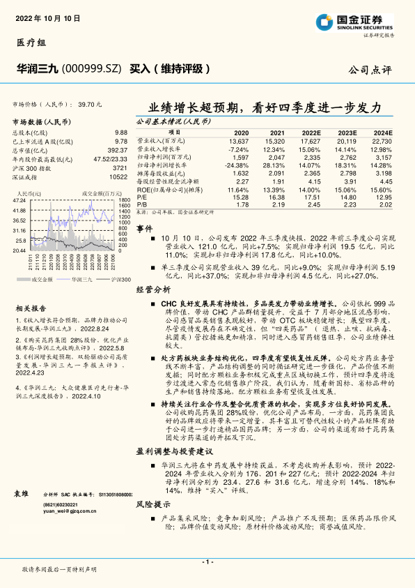华润三九在2022年第三季度取得了超出预期的业绩增长,主要得益于其CHC业务的稳健发展、处方药业务的结构优化以及通过战略性并购昆药集团实现的产业协同。公司通过多品类发力、渠道拓展和资源整合,持续巩固其在大众健康医疗领域的领先地位。尽管面临产品集采、市场竞争等潜在风险,但其清晰的增长路径和稳健的财务预测,支撑了分析师对其未来发展的积极预期,维持“买入”评级。