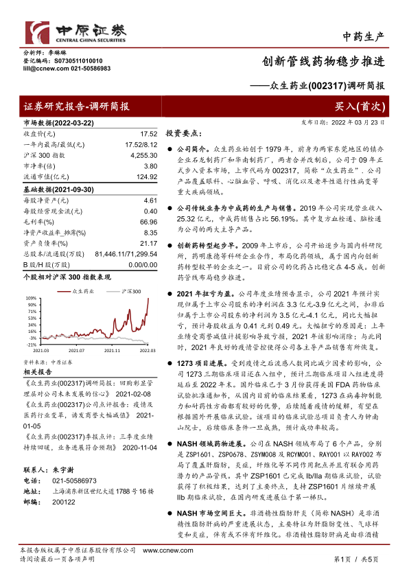 众生药业凭借其稳健的中成药传统业务基础,正成功向创新药领域转型,并在2021年实现了显著的业绩扭亏为盈。公司在流感、NASH、IPF、肿瘤及DME等多个重大疾病领域布局了多元化的创新药管线,其中流感创新药1273项目由钟南山院士牵头,NASH领域产品ZSP1601处于国内研发第一梯队,这些高潜力创新药有望抓住巨大的未满足市场需求。同时,公司通过实施股权激励计划,将核心团队利益与公司业绩增长紧密结合,为未来的持续发展提供了制度保障。尽管存在广东联盟集采丢标、疫情发展超预期及创新药研发进度低于预期等风险,但公司在创新药领域的先发优势和深厚布局,使其具备较强的长期增长潜力。