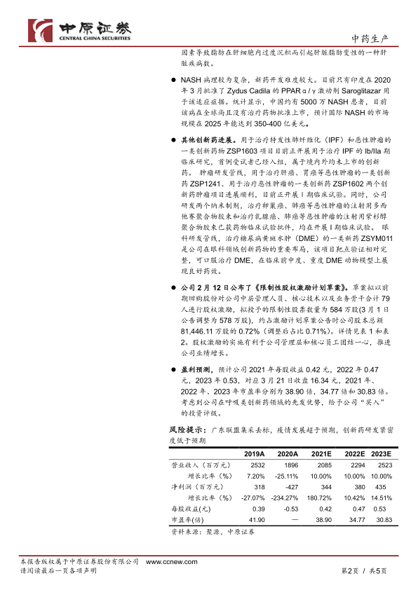 盈利预测, 预计公司 2021 年每股收益 0.42 元, 2022 年 0.47元, 2023 年 0.53,对应 3 月 21 日收盘 16.34 元, 2021 年、2022 年、 2023 年市盈率分别为 38.90 倍, 34.77 倍和 30.83 倍。考虑到公司在呼吸类创新药领域的先发优势,给予公司“买入”的投资评级。