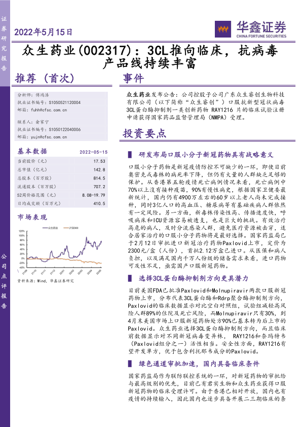 国家药监局作为联防联控系统的一环,对新冠药物的审批给与最高级别的优先,目前已有君实生物和众生药业获得口服新冠药物的临床受理许可。由于香港已相对开放,国内也有疫情的持续输入,因此国内也逐步具备开展二三期临床的条件,也有望加速临床进展。