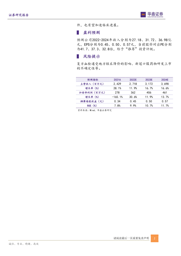 预测公司2022-2024年收入分别为27.18、31.72、36.98亿元,EPS分别为0.45、0.50、0.57元,当前股价对应PE分别为41.7、37.3、32.8倍,给予“推荐”投资评级。