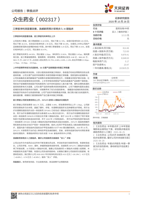 公司过去作为中成药企业近年来不断发展化药业务,并且较早进行创新药布局,有望转型成功。公司在呼吸、NASH、眼科、肿瘤领域皆有创新布局,流感新药 ZSP1273 二期临床试验获得了积极结果,10 月获批 III 期临床伦理。随着公司流感新药 III 期临床大规模入组预期,未来数据发布及报产预期,有望对公司形成积极影响;长期我们看好公司创新药兑现逻辑,有望转型成功。我们预计公司 2020-2022 年归母净利润分别为 4.01 亿元(+26.19%)、4.37 亿元(+8.89%)、4.74 亿元(+8.50%),维持“买入”评级。