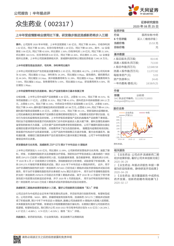 众生药业2020年上半年业绩受到疫情的负面影响,营收和利润同比下滑。但公司经营性现金流表现良好,毛利率和净利率略有提升。随着国内疫情得到有效控制,核心产品销量逐步恢复。公司持续加大研发投入,多元化布局创新药管线,其中流感新药ZSP1273预计下半年启动III期临床研究,有望成为中短期股价催化剂。天风证券维持对公司“买入”评级,看好公司创新药兑现逻辑和转型潜力,但同时也提示了新药研发、行业政策和新品销售等方面的风险。