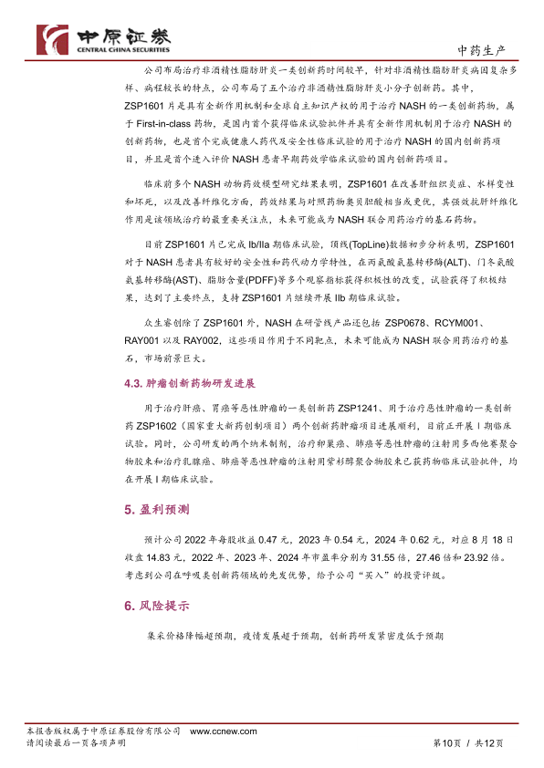 受新冠疫情和防控政策影响,近两年全球和国内的甲型流感处于低流行水平。目前,ZSP1273片的国内研究正处于Ⅲ期临床研究中,已有部分受试者入组,预计2022年末Ⅲ期临床试验的入组有望完成。此外,ZSP1273片已于2022年3月收到美国食品药品管理局(FDA)签发的药物临床试验批准通知书,同意在美国开展临床试验。考虑到该项目的临床试验总项目负责人为钟南山院士,一旦临床条件成熟,预计成功率较高。