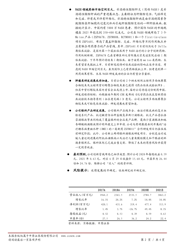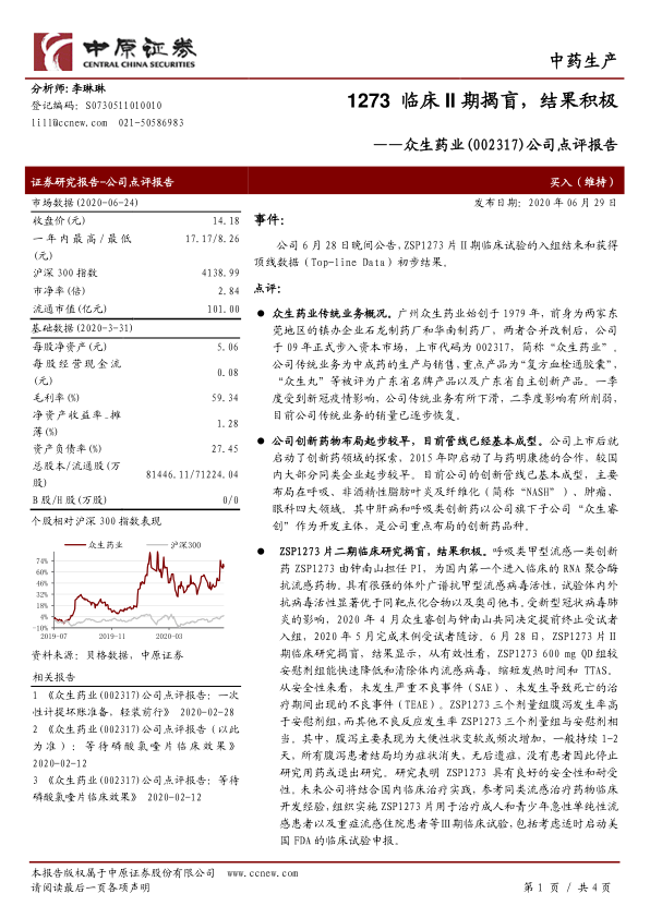 本报告对众生药业进行了公司点评,核心在于其创新药ZSP1273片II期临床试验的积极结果,以及在NASH领域的布局潜力。公司传统业务稳健,创新药管线逐步完善,肿瘤和眼科产品研发也在积极推进。维持对公司“买入”的投资评级,但同时也提示了疫情发展和临床研究的不确定性风险。