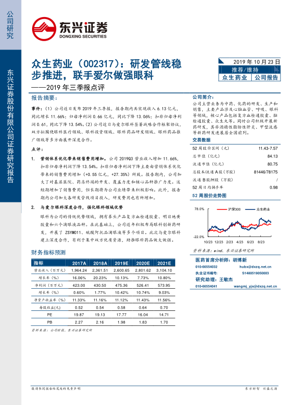 本报告分析了众生药业(002317)2019年三季报,并探讨了其与爱尔眼科战略合作的影响,以及公司在研管线的进展,得出以下核心观点: