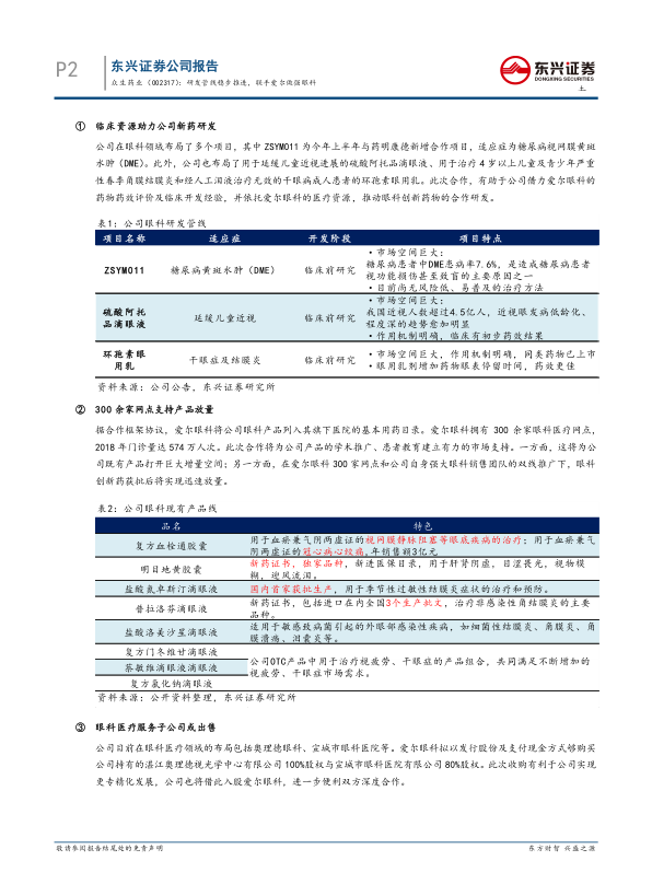2019年三季报点评:研发管线稳步推进,联手爱尔做强眼科