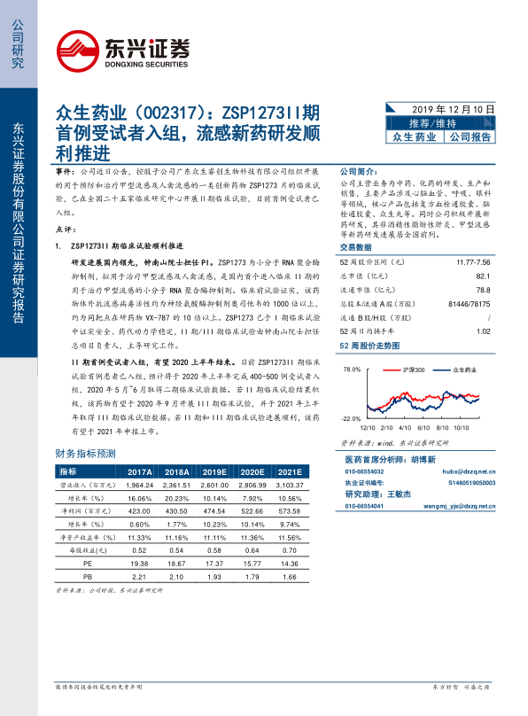 报告维持对众生药业“推荐”评级,主要基于公司传统业务的稳定增长以及ZSP1273、ZSP1601等新药临床试验的稳步推进,预示着公司未来业绩增长的潜力。