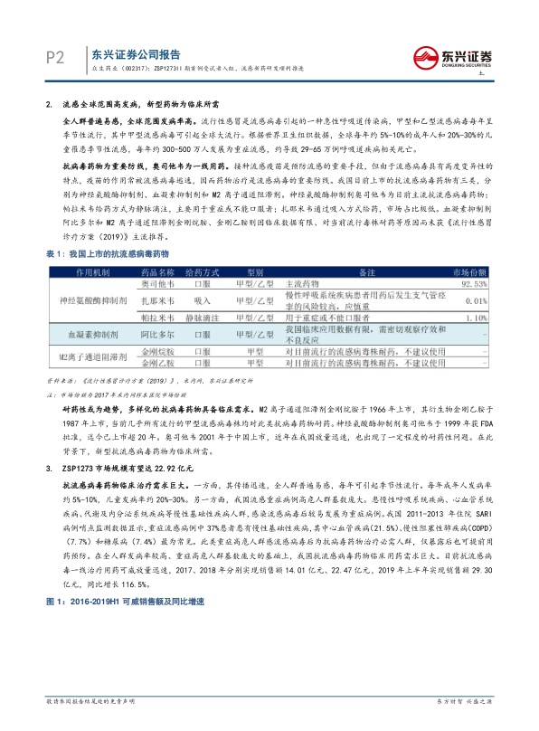 ZSP1273为小分子RNA聚合酶抑制剂,拟用于治疗甲型流感及人禽流感,是国内首个进入临床II期用于治疗甲型流感的小分子 RNA 聚合酶抑制剂。临床前试验证实,该药物体外抗流感病毒活性约为神经氨酸酶抑制剂奥司他韦的1000倍以上,约为同靶点在研药物 VX-787 的10 倍以上。ZSP1273 已于 I期临床试验中证实安全、药代动力学稳定,II期/III期临床试验由钟南山院士担任总项目负责人,主导研究工作。