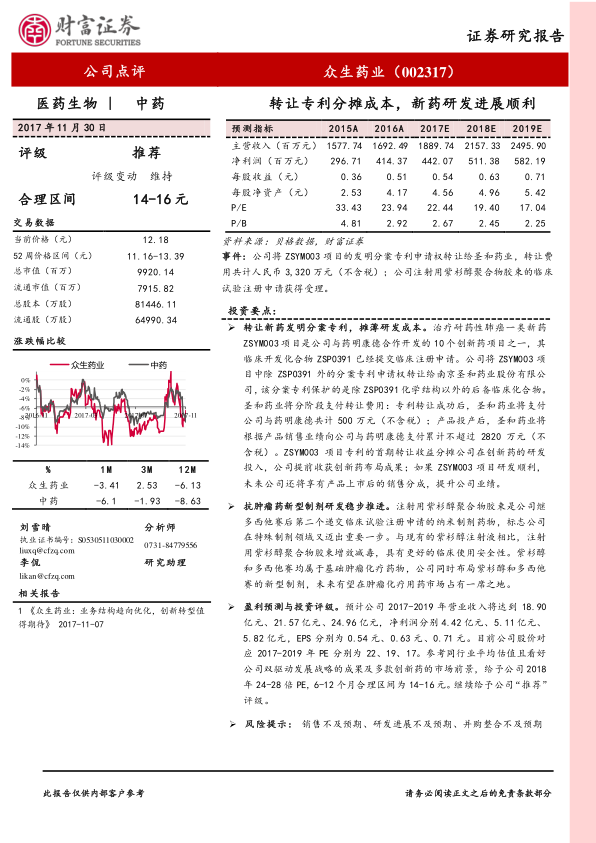 本报告分析了众生药业转让ZSYM003项目专利以分摊研发成本,以及抗肿瘤药新型制剂研发的进展。公司通过转让专利,提前收获创新药布局成果,并有望在未来享有产品上市后的销售分成。同时,注射用紫杉醇聚合物胶束的临床试验注册申请获得受理,标志着公司在特殊制剂领域迈出重要一步。报告预计公司未来几年营业收入和净利润将保持增长,并维持“推荐”评级。