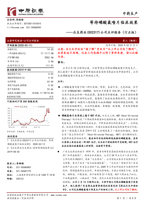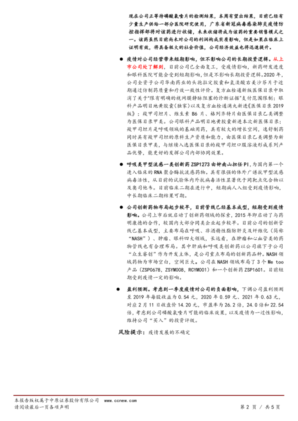中心思想 磷酸氯喹片:疫情下的潜在增长点与社会价值 众生药业的磷酸氯喹片恢复生产获批,在当前新冠疫情背景下,其作为一种体外有效抑制新冠病毒的宿主导向疗法(HDT),具备巨大的社会价值和潜在的经济效益,尽管短期内对公司利润贡献有限。 创新驱动与医保政策利好:构建长期发展基石 公司通过早期布局创新药管线,聚焦呼吸、非酒精性脂肪肝炎及纤维化(NASH)、肿瘤等高潜力领域,并受益于多款产品进入或调整医保目录,以及仿制药一致性评价的通过,为公司的长期可持续发展提供了坚实基础。 尽管疫情对短期经营和新药研发进度造成一定影响,但公司已全面复工,且核心业务和创新管线展现出强劲的长期投资逻辑,分析师维持“买入”评级。 主要内容 磷酸氯喹片:从恢复生产到潜在市场应用 众生药业于2月10日晚间公告,其磷酸氯喹片已获得广东省药品监督管理局批准恢复生产,并已完成相关工作。 磷酸氯喹作为奎宁衍生物,不仅是广谱抗疟药,近年研究还证实其对多种肿瘤具有放射增敏作用。在新冠疫情中,其体外抑制新冠病毒的有效性使其被寄予厚望,并被归类为宿主导向疗法(HDT)。 公司正等待该药的检测结果,并已少量生产供给部分医院研究使用。广东省新冠病毒感染肺炎疫情防控指挥部将对该药进行收储,预示着收储将成为其重要销售模式。 尽管目前该药尚未对公司利润构成实质影响,但若临床证明有效,将显著提升公司的社会价值和经济效益。 经营韧性与产品结构优化:医保目录调整的积极影响 面对疫情挑战,众生药业已全面复工,虽然新药研发进度和眼科医院业务可能受到短期影响,但公司认为这不影响其长期投资逻辑。 2020年,公司全资子公司华南药业的头孢拉定胶囊和氢溴酸右美沙芬片已通过仿制药质量和疗效一致性评价。 医保目录调整带来多重利好:复方血栓通胶囊取消了支付范围限制;独家产品明目地黄胶囊和复方血栓通滴丸新进《医保目录2019版》;羧甲司坦片、维生素B6片、格列齐特片由医保乙类调整为甲类。 特别是羧甲司坦片,作为呼吸领域基础用药,具有较大的增长空间,且公司具备原料生产资质,形成系列产品优势。 创新药管线:多领域布局与未来增长潜力 众生药业自2015年起与药明康德合作,较早布局创新药领域,目前已形成覆盖呼吸、非酒精性脂肪肝炎及纤维化(NASH)、肿瘤、眼科四大领域的创新管线。 呼吸类甲型流感一类创新药ZSP1273由钟南山担任PI,是国内首个进入临床的RNA聚合酶抗流感药物,体外广谱抗甲型流感病毒活性显著优于同靶点化合物及奥司他韦,临床二期结果值得期待。 在NASH这一市场空白且空间巨大的领域,公司布局了3个Me too产品(ZSP0678,ZSYM008,RCYM001)和一个创新药ZSP1601。 肝病和呼吸类创新药主要由公司旗下子公司“众生睿创”负责开发,是公司未来业绩增长的重要驱动力。 盈利预测与投资建议:维持“买入”评级 考虑到一季度疫情对公司经营的负面影响,分析师下调了盈利预测:预计2019年、2020年和2021年每股收益分别为0.54元、0.59元和0.63元。 对应2020年2月11日收盘价14.20元,市盈率分别为26.2倍、24.0倍和22.54倍。 尽管下调了短期盈利预测,但鉴于磷酸氯喹片潜在的临床效果以及疫情影响的暂时性,分析师维持公司“买入”的投资评级。 总结 众生药业在当前疫情下,凭借磷酸氯喹片恢复生产的获批,展现出其在公共卫生事件中的潜在贡献和市场机遇。 公司通过积极的产品结构调整,包括多款产品进入新版医保目录和通过仿制药一致性评价,有效提升了核心业务的竞争力和市场覆盖。 长期来看,公司在呼吸、NASH、肿瘤等关键疾病领域的创新药管线布局,特别是ZSP1273和NASH系列药物,将是驱动其未来业绩持续增长的核心动力。 尽管短期盈利预测因疫情影响有所下调,但分析师基于公司在创新药领域的深厚积累和多重增长潜力,维持“买入”评级,凸显了对公司长期价值的认可。