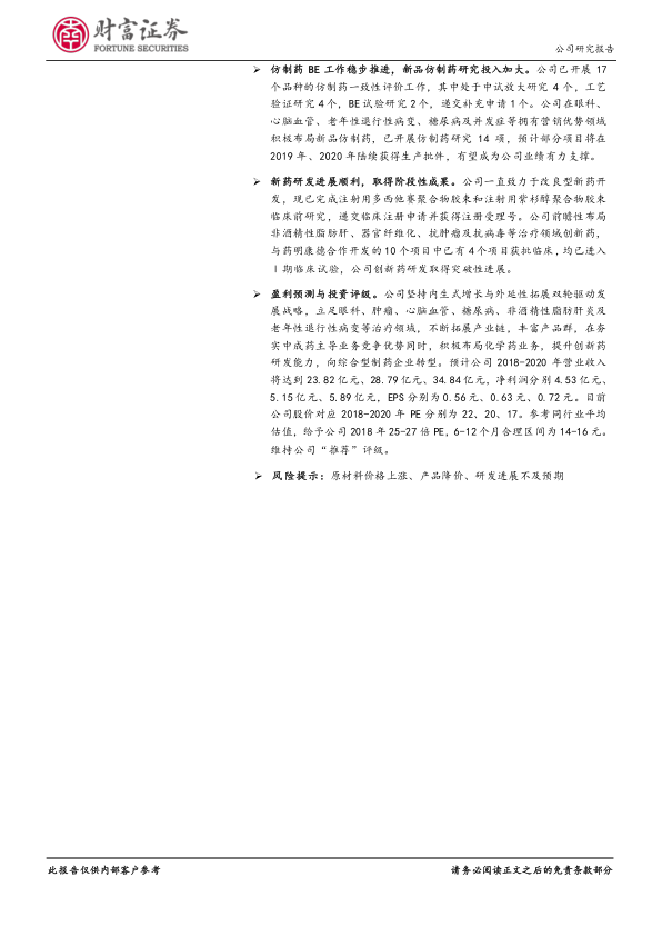 公司积极推进仿制药一致性评价工作,已开展17个品种的评价,其中4个处于中试放大研究,4个处于工艺验证研究,2个处于BE试验研究,1个已递交补充申请。同时,公司在眼科、心脑血管、老年性退行性病变、糖尿病及并发症等具有营销优势的领域积极布局新品仿制药,已开展14项研究,预计部分项目将在2019年和2020年陆续获得生产批件,有望成为公司未来业绩的有力支撑。
