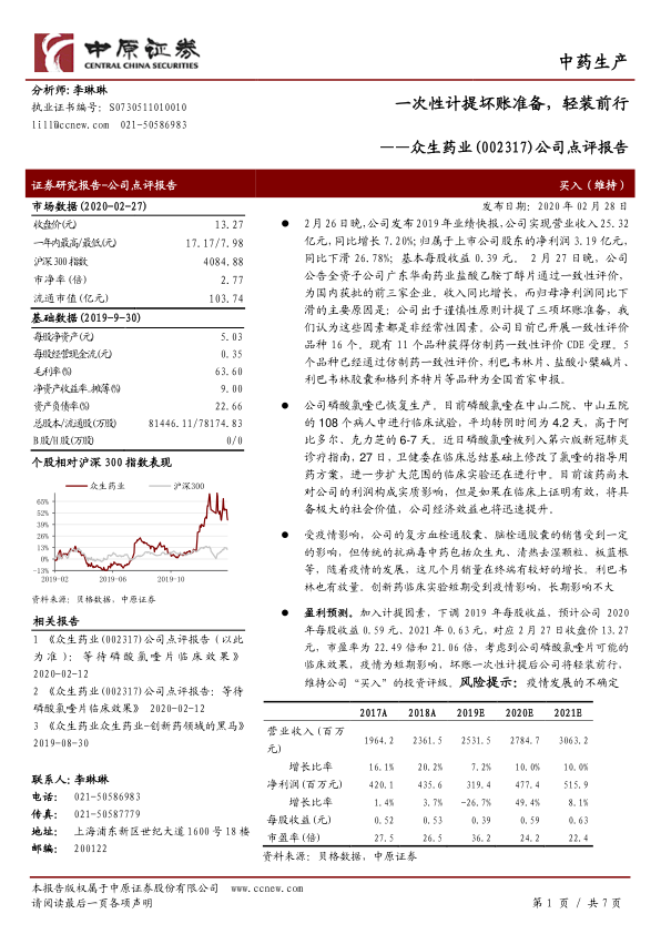 考虑一次性计提因素,下调2019年每股收益。预计公司2020年每股收益0.59元、2021年0.63元。对应2月27日收盘价13.27元,市盈率为22.49倍和21.06倍。鉴于磷酸氯喹片的潜在临床效果、疫情的短期影响以及坏账一次性计提后公司将轻装前行,维持公司“买入”的投资评级。