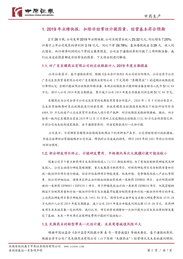 众生药业2019年业绩受到一次性坏账准备、研发费用计提和商誉减值等非经常性因素的显著影响,导致归母净利润同比下滑26.78%。然而,这些计提旨在优化资产结构,使公司能够轻装前行。在业务层面,公司在应对新冠疫情中展现出潜力,磷酸氯喹片在临床试验中表现积极,且已恢复生产并被纳入诊疗指南,未来有望带来可观的社会和经济效益。尽管部分传统药物销售受疫情短期影响,但抗病毒中药和利巴韦林销量逆势增长。