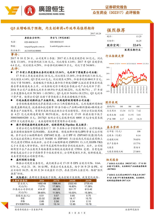 本报告对众生药业(002317)的三季报进行了分析,并维持“强烈推荐”评级。