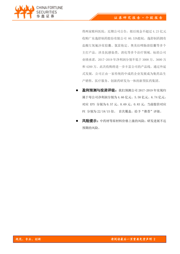 报告还指出,公司通过外延并购不断丰富产品线,从传统中成药企业向集药品生产销售、医疗服务、创新药研发为一体的新型医药集团转型。基于这些因素,报告首次覆盖众生药业,给予“推荐”评级。