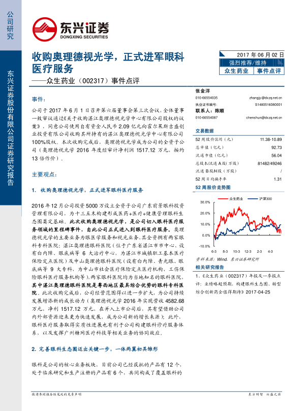 此次收购是众生药业切入眼科医疗服务领域的里程碑事件,标志着公司正式进入眼科医疗服务市场。此前,公司已于2016年12月投资5000万元设立全资子公司广东前景眼科投资管理有限公司,旨在为“十三五”末构建形成“医药+医疗+健康管理”的眼科生态圈奠定基础。通过本次收购,众生药业的经营范围得以进一步扩大,奥理德视光学有望在并入上市公司后,借助众生药业的内外部资源实现更快速的发展,成为公司新的业绩增长来源。同时,眼科医疗服务的实质性进展也将有力推动公司构建完善的眼科诊疗服务体系,并与广州糖网医疗科技等现有相关业务产生显著的协同效应,共同提升公司在眼科大健康领域的综合竞争力。