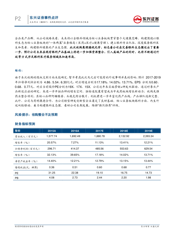 报告在暂不考虑本次收购及未来可能的外延事项并表影响的前提下,对众生药业的财务表现进行了预测。预计2017-2019年,公司归属于母公司股东的净利润将分别达到4.86亿元、5.54亿元和6.30亿元,对应年度增长率分别为17.18%、14.02%和13.71%。同期,每股收益(EPS)预计分别为0.60元、0.68元和0.77元,对应当前股价的市盈率(PE)分别为19倍、17倍和15倍,显示出合理的估值水平。