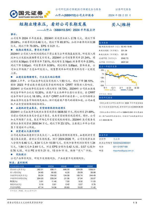 山外山公司2024年上半年业绩受高基数和费用投入增加影响,呈现短期承压态势,营收和净利润同比显著下滑。然而,公司在血液净化设备领域保持国产龙头地位,剔除偶发性因素后设备业务实现稳健增长,市场份额领先。血液净化耗材业务受益于集采政策,展现出强劲的增长势头。尽管存在产品降价、研发和放量不及预期等风险,但基于其核心业务的竞争力、国产替代的机遇以及集采带来的市场空间,报告维持“买入”评级,并对公司未来几年的盈利能力持乐观预测,认为公司长期发展前景广阔。