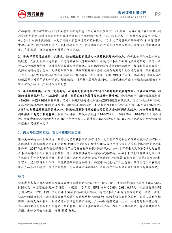 本报告的核心观点是,众生药业在2017年上半年业绩表现略超预期,尤其是在剔除同期投资收益影响后,净利润增速显著。公司通过营销体系改革、产品创新研发以及构建眼科生态圈等多重策略,正转型为综合创新型药企。