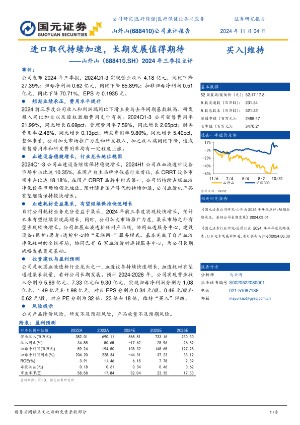国元证券维持对山外山公司的“买入”评级。作为我国血液透析行业龙头之一,公司血透设备持续快速增长,血透耗材有望通过集采实现放量,长期发展前景看好。